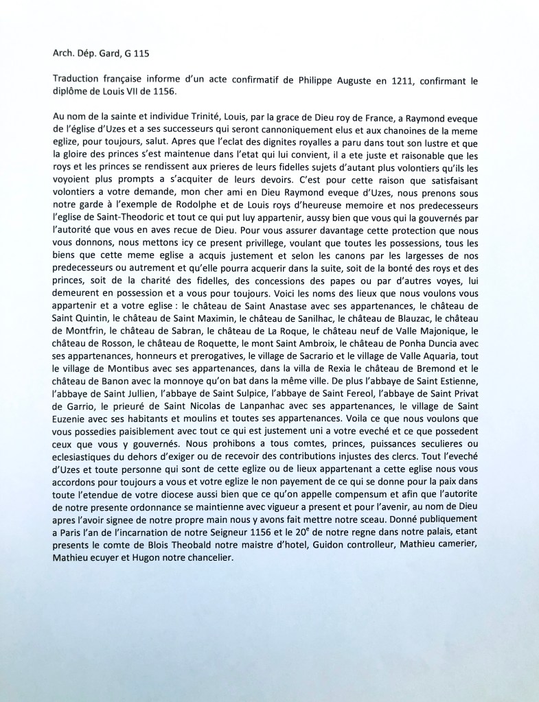 Edition du diplôme donné en 1156 par le roi Louis VII à l’évêque d’Uzès.